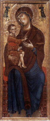 Dichiarata protettrice nel 1859, l’icona rappresenta la Vergine «seduta su di un trono riccamente ornato di palmette, con cuscino rosso. Indossa sulla tunica azzurra un maphorion rosso cupo profilato in oro e trapunto di stelle, dal quale spunta una cuffia del colore della veste. Regge il Bambino con la destra. Questi indossa una corta tunica di color rosso ruggine, con sottili crisografie, fermata in vita da un’alta fascia rosso-arancio. Benedice con la destra, mentre con la sinistra regge il rotulo. I nimbi sono realizzati a pastiglia con un motivo a reticolo rilevato. Gli angoli superiori sono occupati dalle figure di due angeli reggituribolo, su nuvolette, certo aggiunte seriori. Il retro della tavola è diviso in due riquadri dai tre listelli di sostegno alle assi, fissati su di una sottile tela bianca, amalgamata al legno con mestica e imprimitura, probabilmente nella seconda metà del Cinquecento. Nel riquadro superiore è un disco raggiato con dodici raggi ondulati, al centro di un disco più grande orlato da un nastro, stemma della famiglia Caracciolo, feudataria di Cerignola nel XVI secolo. Nel riquadro inferiore vi sono quattro cornucopie ricolme di frutta, tenute insieme a mo’ di nastro continuo da quattro mascheroni» (Pina Belli D’Elia D’Elia, M. Stella Calò Mariani, Valentino Pace, Icone di Puglia e Basilicata dal Medioevo al ‘700, Milano, Mazzotta, 1988, p. 113). La festa patronale è celebrata l’8 settembre.