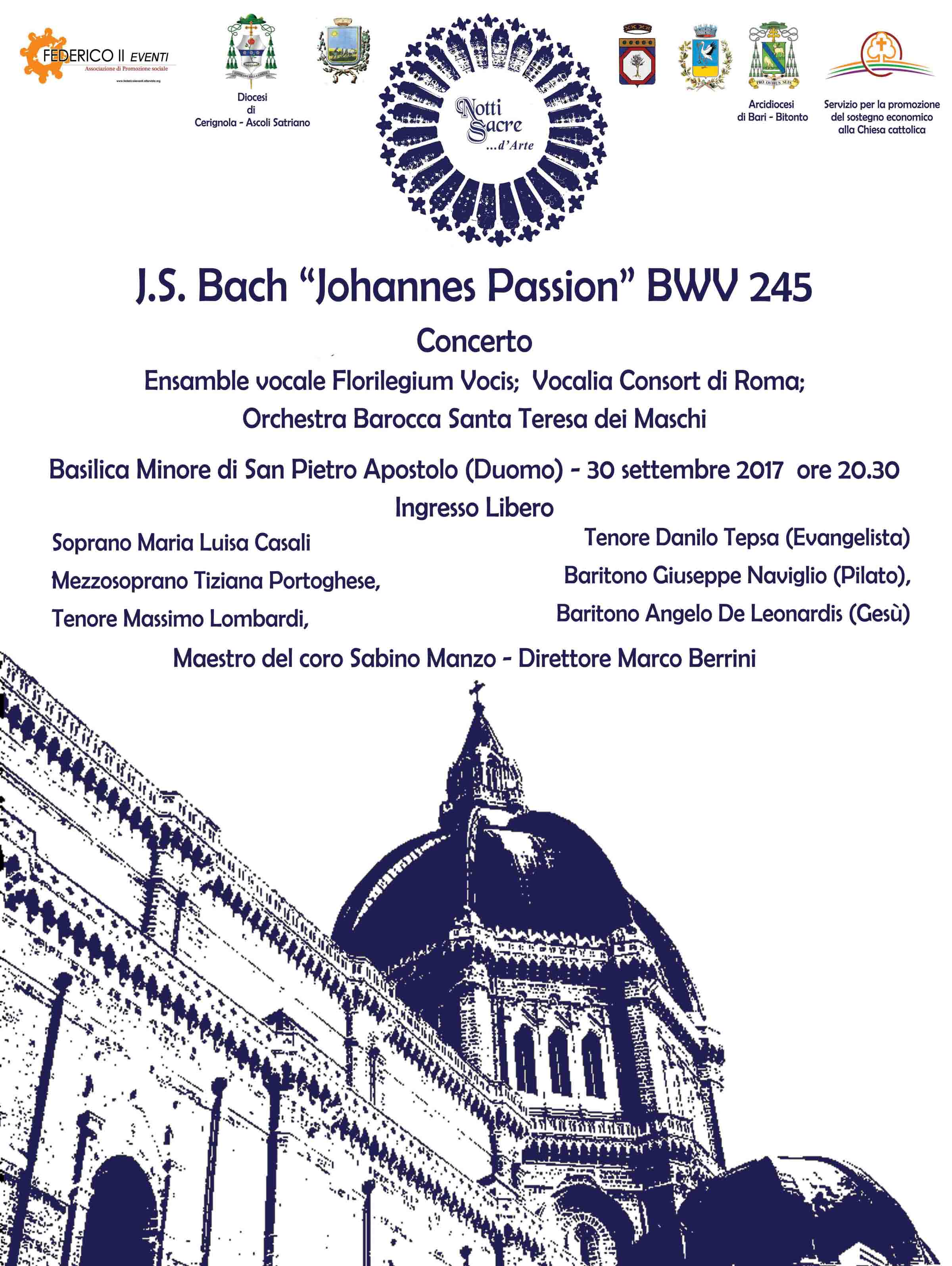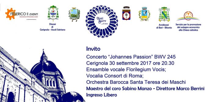 Sabato 30 settembre alle ore 20.30 la A.p.s “Federico II Eventi” presenta il concerto “Johannes Passion” BWV 245 di J.S. Bach nella Cattedrale di San Pietro Apostolo di Cerignola con il patrocinio della Diocesi di Cerignola – Ascoli Satriano. Grazie alla sensibilità di S.E. Mons. Luigi Renna, Vescovo della Diocesi, la Cattedrale e la città ospiteranno la prima assoluta esecuzione in Puglia della “Passione secondo Giovanni” BWV 245 per soli orchestra e coro eseguita da Ensemble Vocale “Florilegium Vocis”,”Vocalia Consort” di Roma,”Orchestra Barocca S. Teresa dei Maschi”; soprano Maria Luisa Casali, mezzosoprano Tiziana Portoghese; tenore Massimo Lombardi; tenore Danilo Tepsa (Evangelista); baritono Giuseppe Naviglio (Pilato); baritono Angelo De Leonardis (Gesù). Maestro del coro è Sabino Manzo con la direzione d’orchestra del Maestro Marco Berrini.
