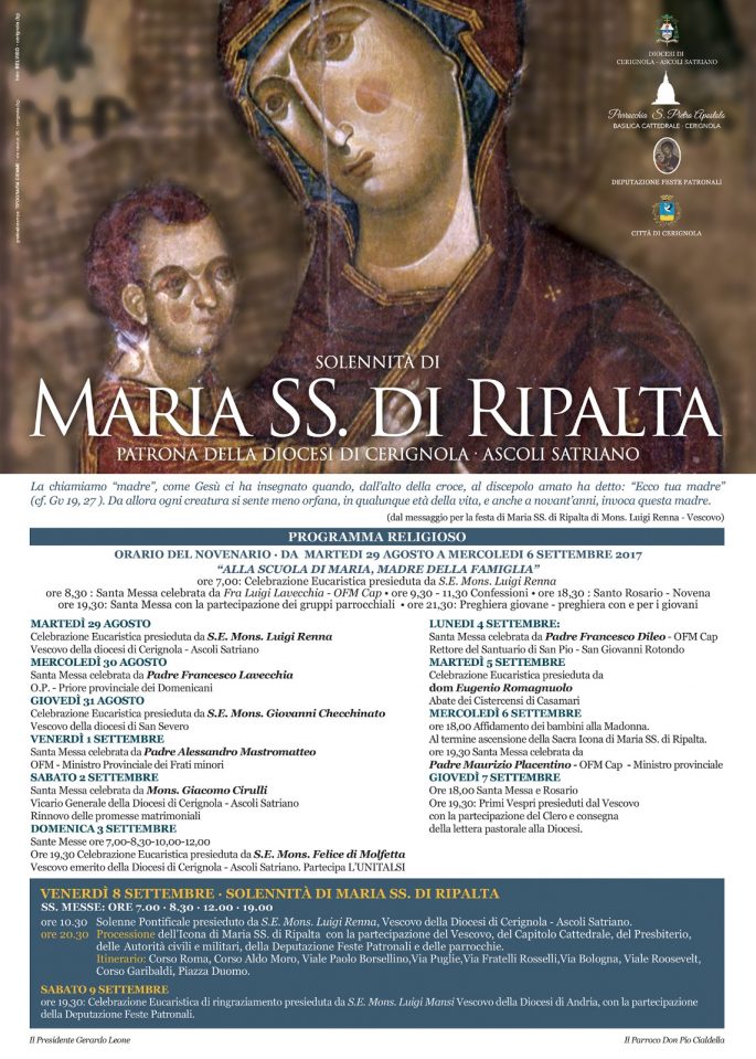Sabato 2 settembre 2017, alle ore 21, attendo la Città di Cerignola in Duomo per supplicare la Madonna di Ripalta di ridonarci la pace, di convertire i cuori, di restituire i Cerignolani alla loro dignità di Figli di Dio e onesti cittadini.