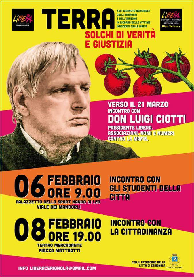 In preparazione alla XXIII Giornata nazionale della Memoria e dell’Impegno in ricordo delle vittime e innocenti delle mafie – “Terra. Solchi di verità e giustizia”, promossa dal MIUR per il 21 marzo p.v. sul tema , l’associazione Libera (Presidio di Cerignola) organizza due incontri con Don Luigi Ciotti: Martedi, 6 febbraio 2018, ore 9, con gli studenti delle scuole di Cerignola presso il Palazzetto dello sport “Nando Di Leo” e giovedi, 8 febbraio, alle ore 19, con la cittadinanza, presso Piazza Matteotti (Teatro Mercadante).