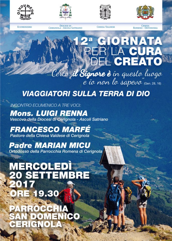 Si svolgerà mercoledi, 20 settembre 2017, alle ore 19.30, presso la chiesa di san Domenico in Cerignola, l’incontro ecumenico a tre voci in occasione della 12^ Giornata per la cura del creato. Il dibattito si terrà tra il vescovo Luigi Renna, Francesco Marfè, Pastore della Chiesa Valdese di Cerignola e Padre Maria Micu, Ortodosso della Parrocchia Romena in Cerignola.