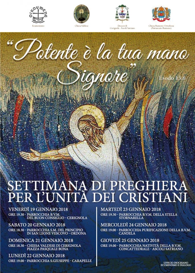 In occasione della Settimana di preghiera per l’ Unità dei Cristiani, venerdi, 20 gennaio 2023, alle ore 20, presso la Chiesa Valdese in p.zza Pasquale Bona a Cerignola, si terrà una Veglia Ecumenica.