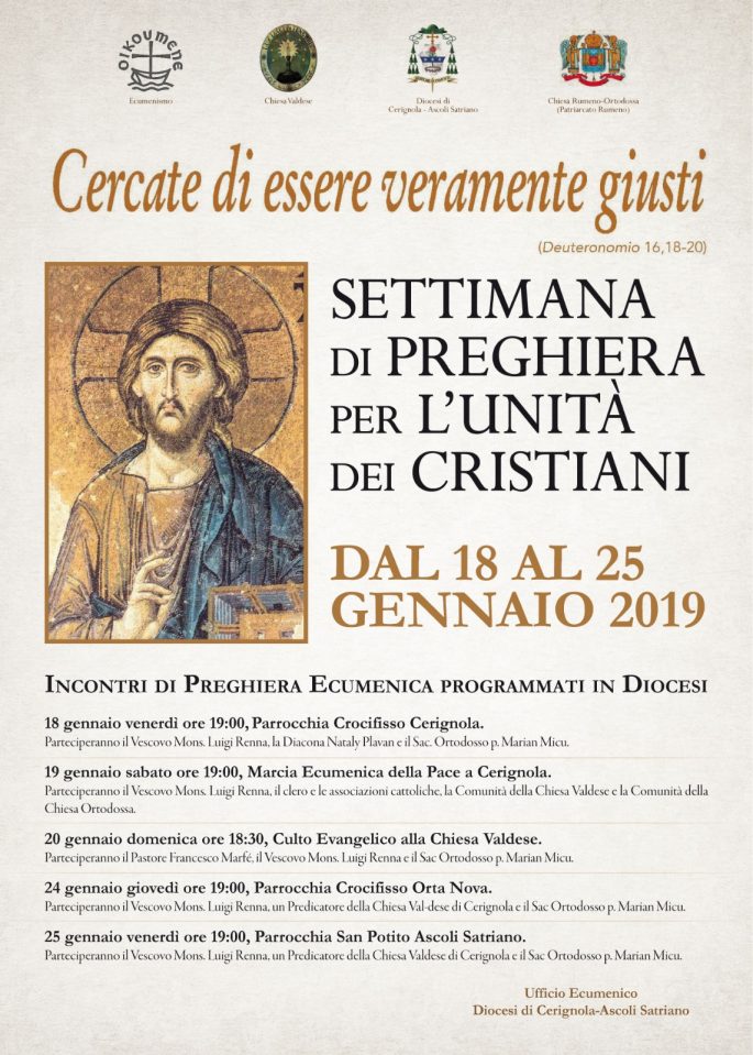 “Cercate di essere veramente giusti” è il tema degli incontri ecumenici di riflessione per la Settimana di preghiera per l’unità dei cristiani che si svolgerà dal 18 al 25 gennaio 2019 come da programma.