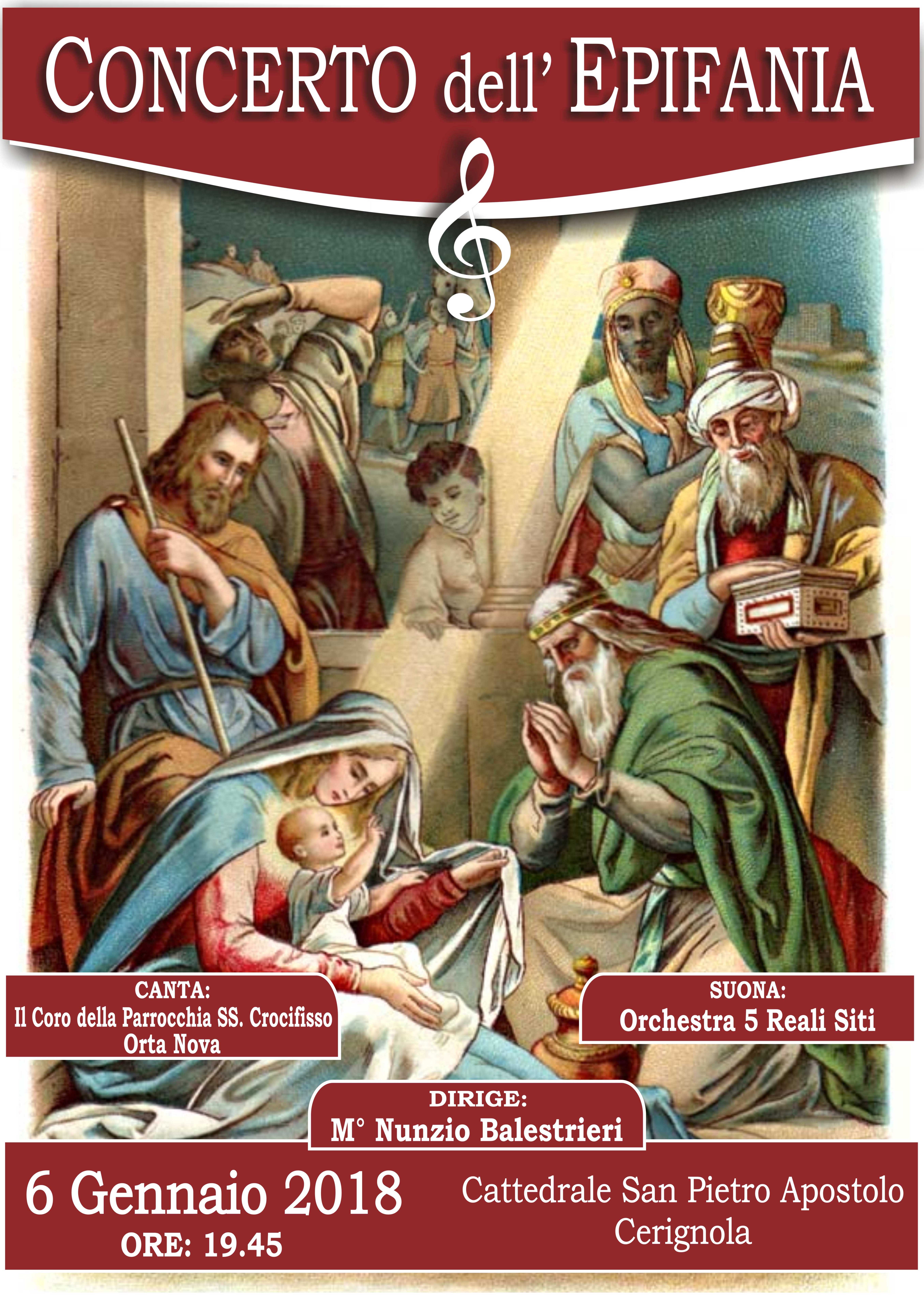 Parrocchia San Pietro (Duomo) Concerto dell’Epifania 5 Gennaio 2018 pierluigimastroserio Sabato, 6 gennaio 2018, Concerto dell’ Epifania del Coro della Parrocchia SS. Crocifisso di Orta Nova. Il concerto si terrà presso il Duomo di Cerignola alle ore 19.45 concerto_epifania_2018