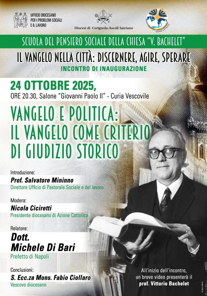 La Diocesi di Cerignola-Ascoli Satriano, attraverso l’Azione Cattolica diocesana e l’Ufficio di Pastorale Sociale e del Lavoro, annuncia l’avvio della Scuola del Pensiero Sociale della Chiesa “Vittorio Bachelet”, un percorso triennale di formazione fondato sull’idea che solo una fede profondamente vissuta può generare autentico impegno sociale e politico.